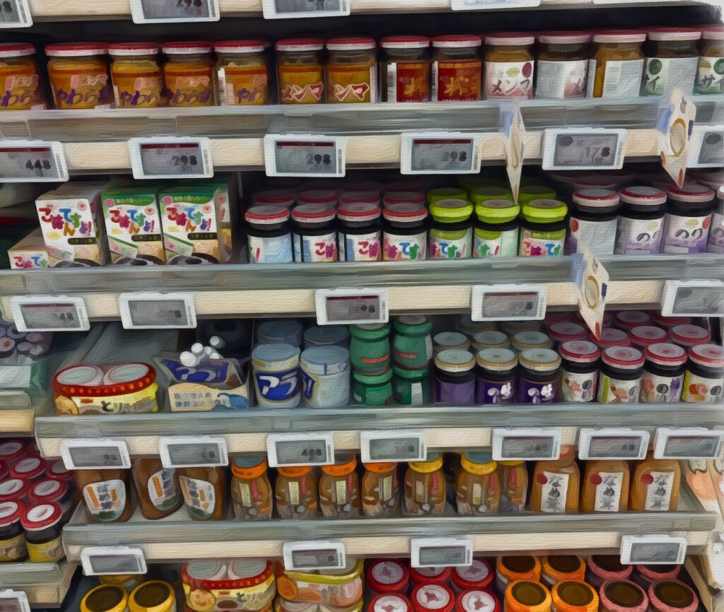 瓶といえば「ごはんですよ」で有名、お馴染み「桃屋」さんなイメージがある。イオンの瓶コーナーにも桃屋ブランドがかなり並べられていた。これだけ商品を開発できる企業努力には脱帽である。
