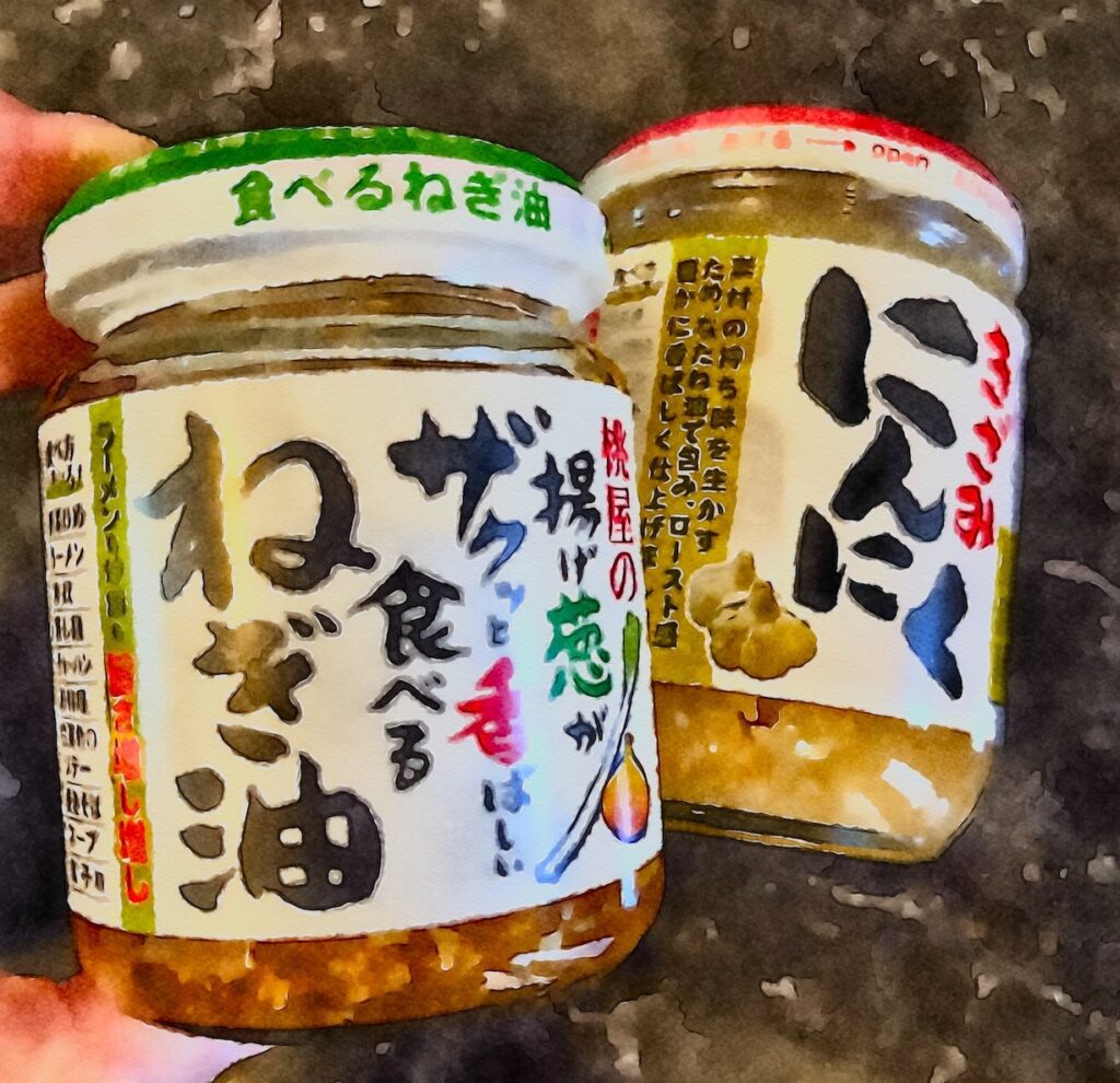 我が家定番の桃屋「きざみにんにく」と、初挑戦の「揚げ葱がザクッと香ばしい食べるねぎ油」。何ともそそられるタイトルをしている。
