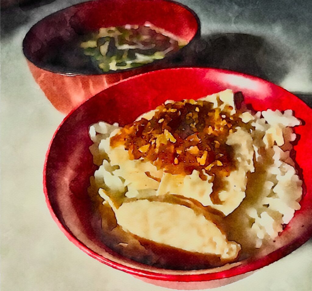 今日の朝食は、ごはんの鶏ハムのっけだ。その上に豪華めにネギ油のザクザクした部分をのっけてみた。