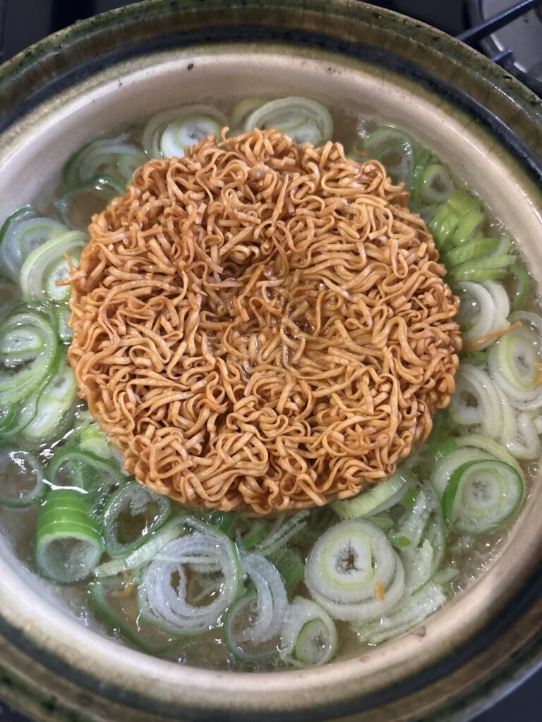 土鍋で適当な量のお湯を沸騰させて、大量のネギとチキンラーメンをオン。
