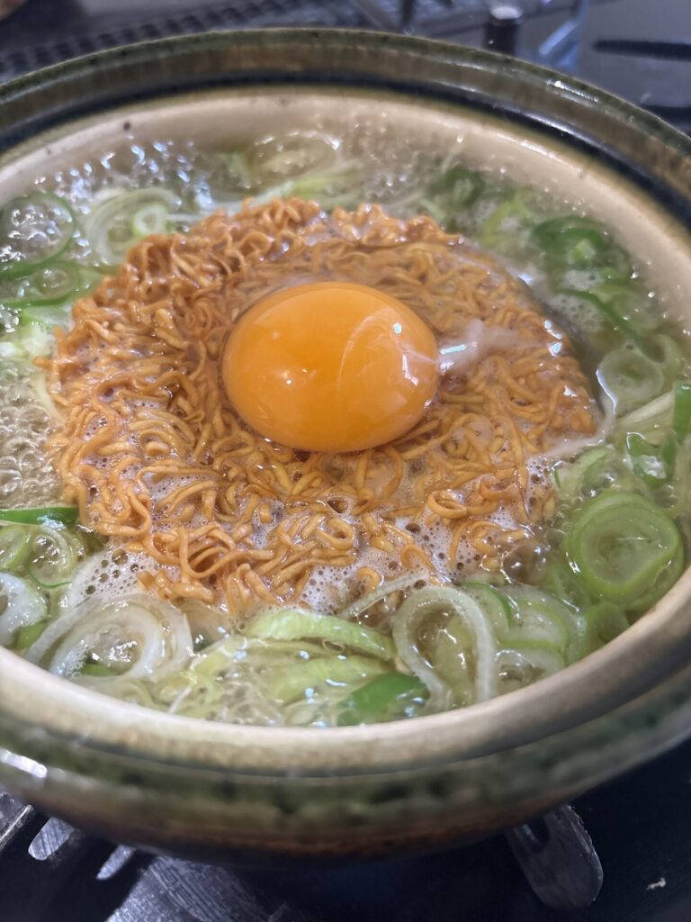そんな日は気にせず朝からチキンラーメンを食べる。しかもひとり用の土鍋で豪華に作るのだ!