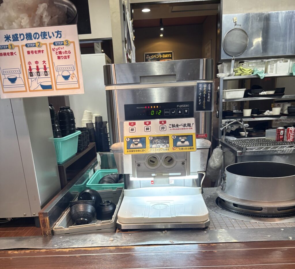 お椀を機械の下において、大・中・小(盛り)のどれかのボタンを押すと、ふわっとご飯が出てくる。あまり経験したことがなく興味深い・・・