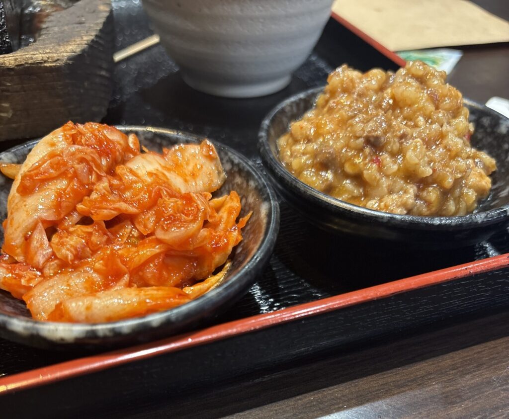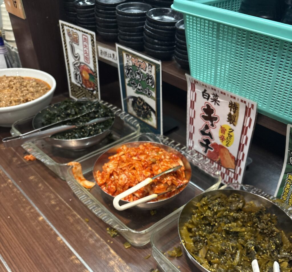 そしてこれが噂の「おかず食べ放題」キムチ、高菜、ワカメ和え、牛しぐれが食べ放題なのである。